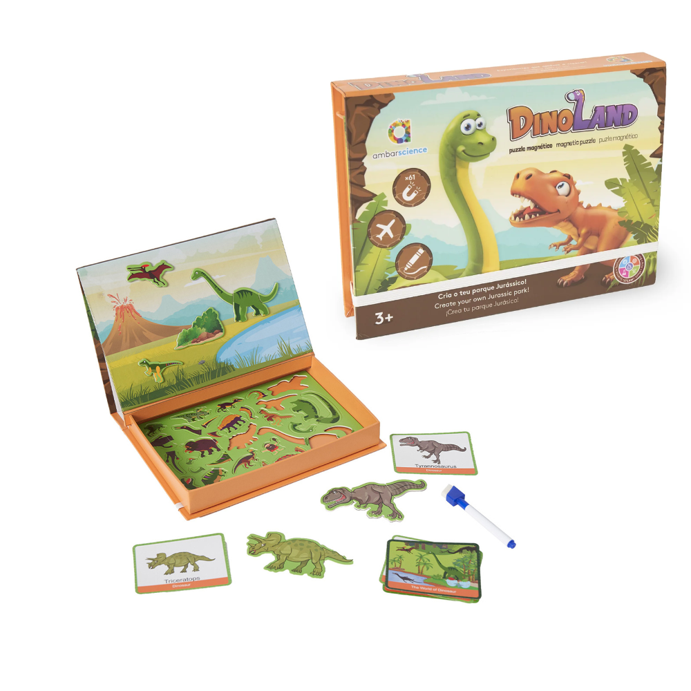 AMBARSCIENCE Magnetic Puzzle "Dinoland", let children create the most fantastic Jurassic adventures. Specially designed for preschool children (ages 3+), this puzzle helps kids explore their imagination by mixing and matching pieces to create Jurassic scenes and replicate inspirational models from the fascinating world of dinosaurs. It includes 61 magnetic dinosaur pieces, 5 inspirational model cards, 1 marker to personalize scenes, and a portable double-sided magnetic base (magnetic board on one side and wipe-clean board on the other). This puzzle is an educational tool that combines fun, scientific learning, and creativity, developing motor and cognitive skills while stimulating imagination. The pieces are made of high-quality plastic, feature FSC™ certification, and come in a handbag-style carrying case. Playing is the best way for children to explore and learn.