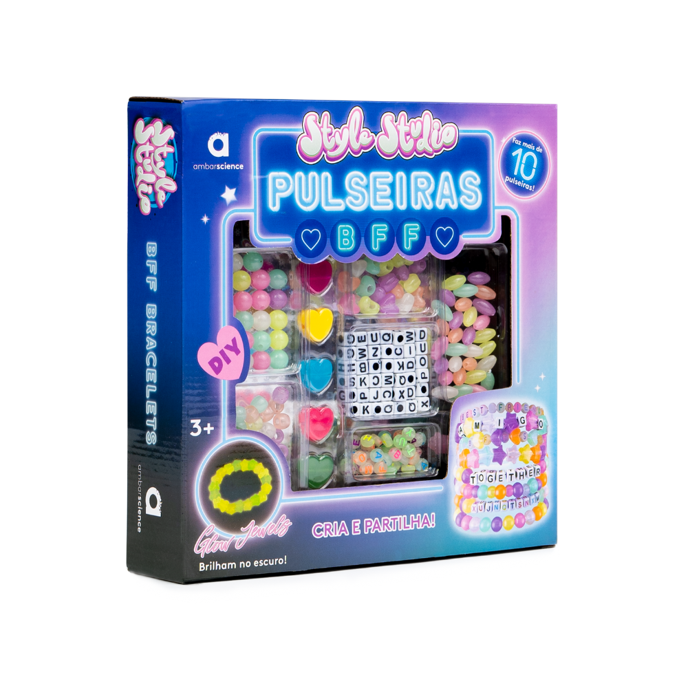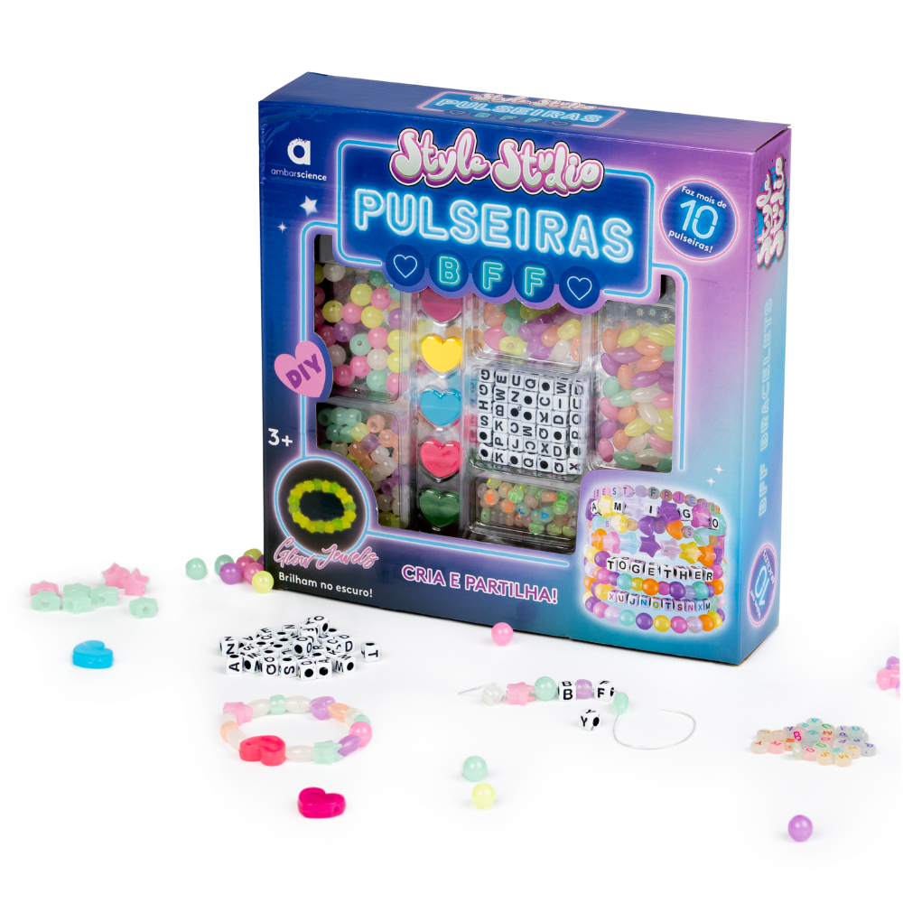 AMBARSCIENCE Bracelet Creation Kit "BFF Bracelets" , create, personalize, and share friendship bracelets. Specially designed for preschool children (ages 3+), this kit helps kids explore their creativity by personalizing bracelets with words, names, or special messages, either for themselves or as gifts. With 240 pieces, including glow-in-the-dark colorful beads and alphabet letters in various shapes, each creation is an opportunity to stimulate curiosity, creativity, learning, and fun. Pieces are made from high-quality materials and feature FSC™ certification. Playing is the best way for children to explore and learn.